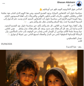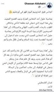 وجاء في منشور العميل المجرم غسان الدهيني: ” بمناسبة حلول أحد الشعانين المبارك وعيد الفصح المجيد، وفي هذا اليوم الذي تتجلى فيه عظمة التآخي وتتلاقى القلوب بالرجاء، أتقدم بأطيب التهاني والتبريكات إلى أهلنا المسيحيين الكرام رعية كنيسة الروم الأرثوذكس بمناسبة حلول أحد الشعانين المجيد الذي يجسد حلم الدخول إلى المدينة المقدسة تحت راية السلام والعدل، فكل عام وأنتم بخير”.