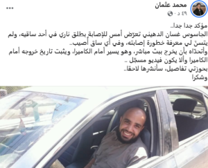 وقال الصحفي والمطلع على شؤون ميليشيات غزة محمد عثمان، إن الجاسوس غسان الدهيني تعرّض أمس للإصابة بطلق ناري في أحد ساقيه.