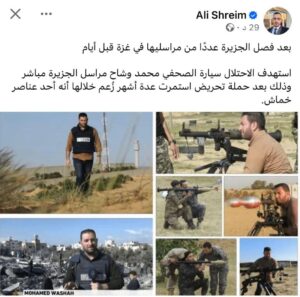 فبعد ساعات قليلة على اغتيال الزميل محمد وشاح، أطلق شريم حملة جديدة محاولًا تبرير الجريمة الإسرائيلية، مدعيًا أن الصحفي في قناة الجزيرة مباشر كان أحد عناصر المقاومة الفلسطينية.
