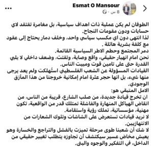 وقال في نهاية تفنيده “ليس كل من يتكلم بهدوء عاقل، ولا كل من ادعى التحليل صادق، ولا كل من أتقن لغة العدو أصبح خبيراً، التحليل الذي يبدأ بلوم الضحية وينتهي بتبرئة الجلاد ليس رأياً، بل انحراف في الوعي يجب كشفه ومقاومته”.