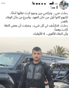وكتبت المدعوة آمنة أبو شباب في منشور على “فيس بوك”: “رحلت عني وتركتني بين وجوه كنت تظنها أماناً، لكنهم كانوا أول من خان العهد وأسرع من بدل الوفاء بالغدر”.