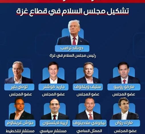 ويشير إلى أن المجلس سيترأسه الرئيس الأميركي دونالد ترمب ويضم شخصيات ذات تأثير سياسي ودبلوماسي وأمني، أبرزهم: ماركو روبيو، ستيف ويتكوف، جاريد كوشنر، وتوني بلير، إلى جانب تعيين نيكولاي ملادينوف عضوًا في المجلس التنفيذي وممثلًا ساميًا لغزة.