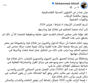وفي منشورات أخرى لهذا المريض النفسي وفق ما يطلق عليه المتابعون والنشطاء عبر المنصات، تحدث العميل التلولي عن سعيه لإسقاط شرعية ما يسمى بمجلس السلام في غزة بقيادة علي شعت، متهمًا إياه بأنه يفتقد الفعالية والشرعية الشعبية داخل القطاع ولن يكون له أي دور حقيقي.