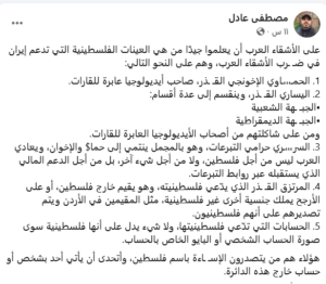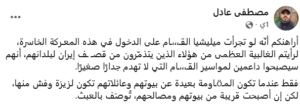 ونشر المدعو مصطفى عصفور مؤخرًا منشورًا على فيس بوك، وصف فيه كتائب القسام بـ “الميليشيات”، مشيرًا إلى أنها غير قادرة حاليًا على الدخول فيما أسماه “معركة إيران”، في إشارة إلى الحرب الأمريكية الإسرائيلية على الجمهورية الإسلامية في إيران.