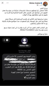 ومؤخرًا نشر عزايزة صورًا لرسائل نصية ادعى أنها تصل لمستفيدين من خدماته الإغاثية عبر مؤسسة “معتز” التي أسسها، والتي وصفها نشطاء بأنها منفذ جديد للسرقة العلنية لأموال المتبرعين على حساب المحتاجين في غزة.