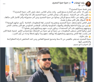 وكتب المدعو أبو جياب مؤخرًا منشورًا مطولًا عن شخصية الناشط البارز في الشبكة التحريضية حمزة المصري، المعروف بسقوطه الأخلاقي والمهني، داعيًا لمتابعته كمصدر موثوق في نقل الأحداث.