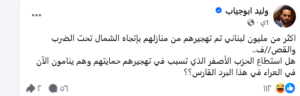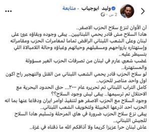ولم يقتصر طرح أبو جياب على مهاجمة المقاومة وحركة “حماس” داخل غزة، بل امتد إلى المطالبة بنزع سلاح حزب الله، حيث كتب مؤخرًا منشورًا اعتبر فيه أن المقاومة هي المتسبب بما لحق بلبنان وغزة من دمار.